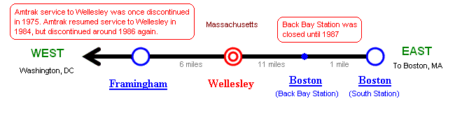 Note: Amtrak service to Wellesley was discontinued in 1975 once. Amtrak resumed service to Wellesley in 1984, but discontinued around 1986. |