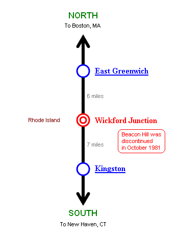 Amtrak Wickford Junction, RI station was located between Kingston, RI and East Greenwich, RI (6 miles south of East Greenwich). Service to Wickford Junction ended due to discontinuance of Beacon Hill in October 1981. The station is currently used for MBTA commuter rail. The location of former Amtrak station was southeast of the current MBTA station (across the track).