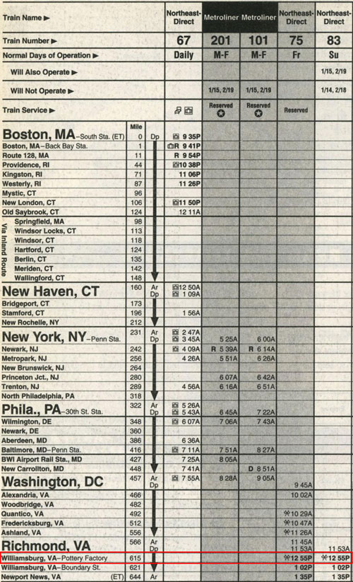 The last Amtrak timetable showing Pottery Factory Station (issued on September 10, 1995) (Source: timetables.org ©1995 National Railroad Passenger Corporation)