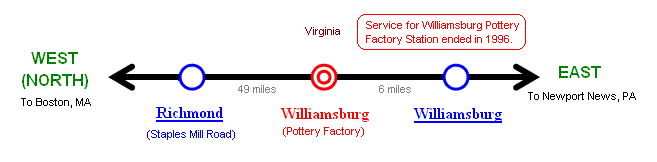 NORTHEAST DIREST SERVICE Note: Amtrak trains no longer stop at Pottery Factory Station. The station was opened in 1993 and closed in 1996. |