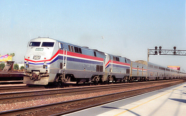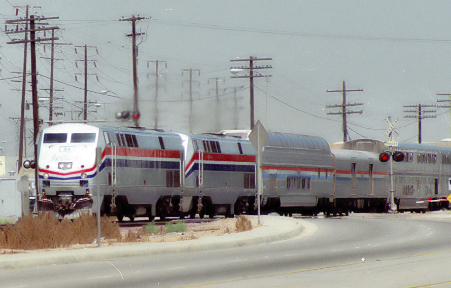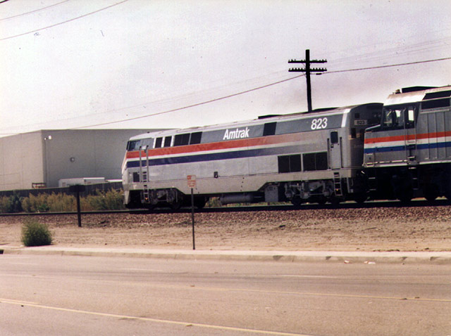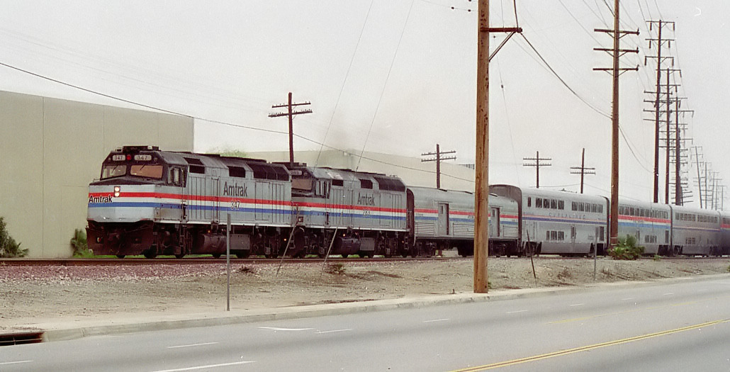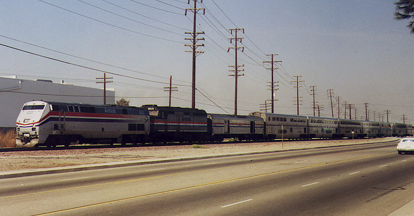 Here is another #36, with P40 828 leading followed by a F40, is seen pulling east also at Los Nietos. Virtually all the cars, except for the Phase III painted diner are Phase IV Superliner II cars: