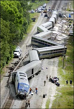 The Silver Star, train 91, derailed at 7:20 a.m. E.D.T. after striking a lumber truck at a marked grade crossing in Hinesville, Ga., approximately 26 miles north of Jesup. The train, which was en route from New York to Miami, had 150 passengers and 14 crewmembers aboard at the time of the accident. A total of 22 passengers and 5 crew members were injured in the incident. The locomotive engineer and truck driver died of their injuries.