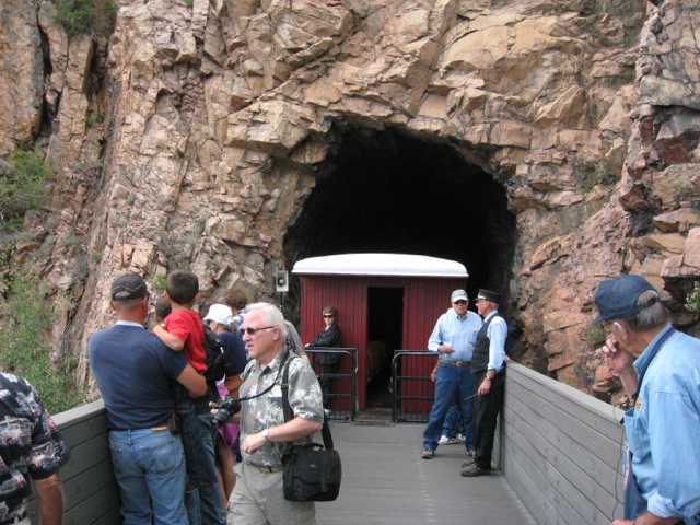 Riders in the open air car enjoy the entrance to Rock Tunnel