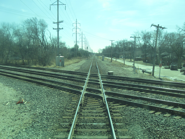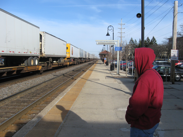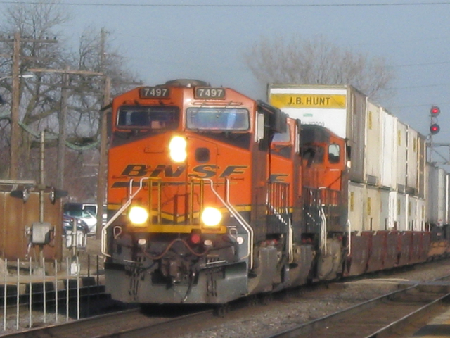 ![]() A westbound BNSF intermodal train runs through Downers Grove on the center track. |