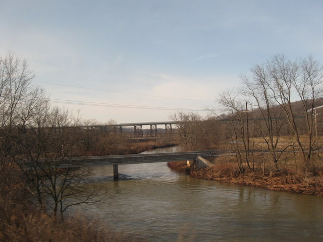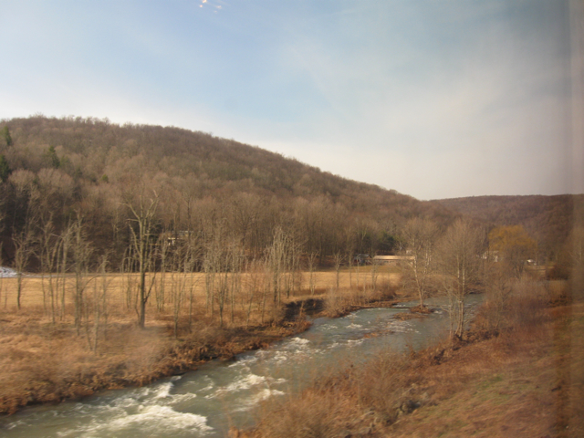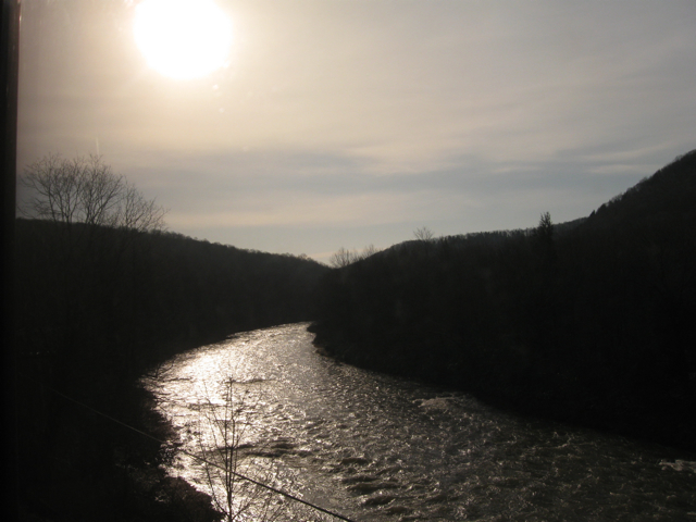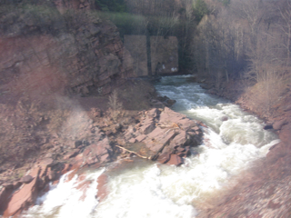 ![]() Rapids and ample whitewater follow the rail line's south side through the mountains. |