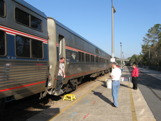 ![]() Passengers detrain from the sleepers near the tail end of the Silver Meteor at Jacksonville. |