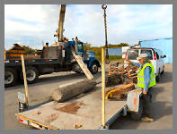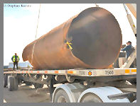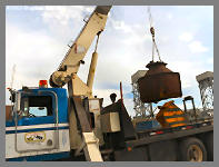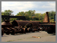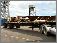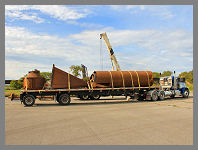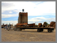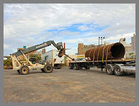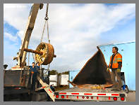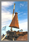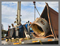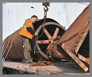 We were fortunate to obtain parts from the unique "Marine Tower" which stood 145' tall. Kevin and Steve brought conveyor belt "buckets" to the HDC, that scooped the grain from the holds of waiting ships, as well as parts from the huge drive assembly that moved the tower. A long "Leg" would be extended from the tower down into the holds of a ship to remove the grain and when empty, the tower was moved to the next hold. | ![]() |