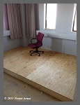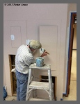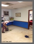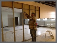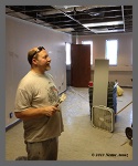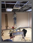 | Left to Right: Tom Kane and helper finish ceiling and new door work. A new raised floor was installed and finished in one of the offices. Mike Pietrocarlo and Nestor Arauz removed the 8 shower stands in the men's shower room. Finished molding around the Gift Shop Doors. |