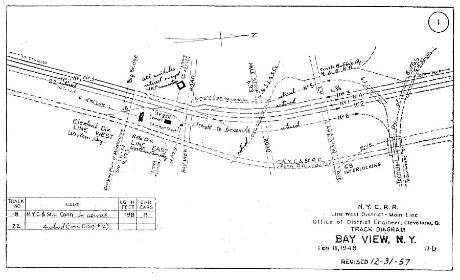 | BAY VIEW "BV" Tower was also synonymous with one of the greatest spectacles in the annals of railroading, as it was here that the "Greatest Train in the World", both Eastbound and Westbound, sections of the "20TH CENTURY LIMITED" would "PASS IN THE NIGHT" as they sped toward their destinations in New York City or Chicago. First inaugurated on June 15, 1902, it had gone through numerous schedule changes until its demise on December 3, 1967. The era between November 1912 and April 1932, had the Centuries scheduled to pass by the tower at 12:03 am eastbound and 12:11 am westbound with an eight minute interval in between. But, the Centuries often were ran in two and three sections in each direction. Sometimes, four or even five sections were not uncommon. On January 11, 1926, "The Century operated in seven eastbound sections and Detroiter in four eastbound sections in conjunction with the New York Auto Show." The New York Central railroad referred to the 60 minutes prior to departure from Grand Central terminal or LaSalle street station as "The Century Hour" as those paying a $10 surcharge would be arriving at the depot to check-in, and board the train while a flurry of redcap activity and photographers in search of celebrities ensued. This was no ordinary train, but the flagship of "The Great Steel Fleet," and to be a patron of this extra-fare, extra-service train was a status symbol of its day from the ordinary businessman to those making the news headlines. You had arrived! Bay View tower had its own "Century Hour" as nothing else was scheduled between 12:03 and 12:30 a.m. You can almost visualize a hot summer night in 1930 as the air is warm with little breeze coming off the lake as this beacon of civilization near a dimly lit country road waits in anticipation. The switches are aligned, the telegraph is silent. Outside the only sound is that of a cricket and a bullfrog in the nearby ditch. The bell rings signaling the approach of a train! The adrenaline is flowing! The headlight of the first section pierces the night as the whistle blares for the bay view road crossing. The second and third sections follow about a minute apart each with green flags flying. You get a glimpse of the illuminated open platform observation cars as they pass by with their red marker lamps and lit blue and white tail signs "20th Century Limited." You hear the third eastbound section blow his whistle at Milestrip road crossing around the bend as he salutes the first westbound section which will shortly come into view. Two more will follow behind him. Indeed, this was Bay View. In the ensuing years, the century would be streamlined in 1938, and later again in 1948. According to NYC Ett #57 issued 06/27/1943 at the height of World War II eastbound #26 passed Bay View Tower at 1:05 am and #25 westbound passed at 1:30 a.m. NYC Ett #76 issued 09/26/1954 showed the times as #26 eastbound at 1:21 am, and 1:43 am westbound for #25. By 1964, NYC Ett #16 "Lake Division" formerly "Erie Division" indicated the times past Bay View as #26 eastbound at 1:37 am, and #25 westbound at 1:45 am. During the World War II years, Gardenville Yard continued to be of strategic importance in facilitating freight traffic and helping to win the war effort employee timetable #57 "Erie Division," dated June 27, 1943 showed that 11 of 12 westbound (scheduled) freight trains daily came over the Gardenville Branch by way of Bay View. The 12th westbound freight train being a Tuesday through Sunday run from east Buffalo to Cleveland. All freight traffic eastbound during this time 12 (scheduled), utilized the east Buffalo railyard. The 13th train was a (scheduled) Erie-Gardenville Tuesday through Sunday operation. In addition, there were 23 westbound and 23 eastbound (scheduled) passenger trains daily passing by Bay View or "BV" tower. This amounted to 71 trains in a twenty-four hour period! Its not known how many troop train or war material trains were operated daily as needed, but they could have easily boosted the total to around 100! By moving westbound freight traffic through Gardenville, and eastbound traffic through East Buffalo, the New York Central kept trains rolling with little chance of a bottleneck. In post-war Western New York in the late 1940's, Gardenville continued to be an important yard and bypass route around the city of Buffalo. "climaxing years of exhaustive tests, the New York Central railroad yesterday (march 19, 1947) placed in operation radio equipment permitting two-way communication between engine and train crews and the yardmaster at the Gardenville"hump." It marked the first installation of its kind on the central system and in Buffalo railroad yards. The hump yardmaster can talk directly to the engineer anywhere in the Gardenville yards" The diesel could be as far away as ten miles and still receive orders." In a preliminary test at Central Terminal, V.C. Chappell, engineer for the General Railway Signal Co., Rochester, seated in a station-wagon equipped with a portable set, succeeded in contacting the hump. He said "reception was very good." the wagon was parked on Curtiss Street. The test was significant because of the distance between the terminal and Gardenville. Quoting I.F. Nash, trainmaster regarding the first ever successful two-way radio communication with engineer Frank Shilling, "the communication system is one of numerous steps in a general modernization program to speed up operations on the railroad. One other diesel engine is nearly fully equipped, and three others are in the process of being equipped." call letters of the new system, licensed to operate on a frequency of 160.41 megacycles, are "WNYH." The equipment installed here by the Rochester firm is the result of tests conducted in the yards at Selkirk. Both Selkirk and the DeWitt yards will shortly have the two-way communication system in effect, we have come a long way in 50 years! On March 1, 1952, the New York Central railroad announced a $1