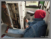| Once the weather gets a little warmer and we get out of each others way, some of our crew will begin sanding, priming and painting the interior of the engine compartment. You can really see the difference on the two doors that have been refinished in the interior view above. |