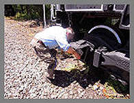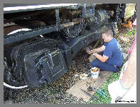 | With the pre-lube and "barring" process completed, we are one step closer to our much anticipated engine start up day. After disconnecting the oil pump and reinstalling the crankcase and flywheel covers, we added two 12 foot, 2/0 "jumper cables" to the engineer's side battery case. These will be used to connect to a battery bank of six 8 volt batteries on a trailer that will be added to the 64 volts from the BSOR's locomotive to give us the 112 volts needed for the starter motor. |
