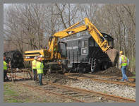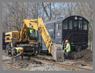The Buffalo Southern Railroad (BSOR) has contracted with "Delta Railroad Construction, Inc." to replace 2000 ties along its 32 miles of track. One of our crew members, Robert Martin, was on hand to photograph one days work on May 2nd. The ROW under the small service road behind BC#43 had sunk and needed 10 new ties to bring it back to grade level. A "Cat M318" made short work of removing the old dirt and stone fill. | ![]() |