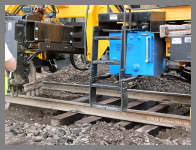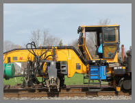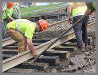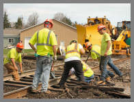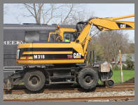 As the excavator uncovered the old ties, it became readily apparent how deteriorated they had become. All of Deltas' equipment is first class and their like new "Nordco" Tie Remover/Inserter was very impressive. The operator was able to quickly remove the rotted ties and install new ones which the crew later spotted along the crossing with their Cat M318. | ![]() |