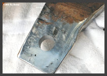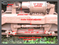 | On the 20th, Rick and I reinstalled the lever after it was primed and painted. A liberal coating of grease allowed the lever to slide into place with ease, but that was the easy part. Getting the clevis pins into the holes while fighting the weight of the brake shoe hanger and the weight of the lever proved to be a challange. Not being able to see the holes from underneath, meant everything had to be done by feel. A drop pit would have been nice! But once the 3/8" cotter pins were opened, we were able to adjust the brake piston travel back to the recommended two inches. |