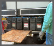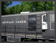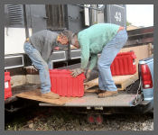 | In anticipation of the new batteries coming, Jim Long and Bob Martin, repainted the two battery compartment covers making sure to preserve the pinstripping. The 14 batteries were delivered safely to the Buffalo Southern Shop on September 14th so I scheduled a crew to move their 12 loaner batteries back to the shop and haul the new ones to the locomotive. |