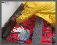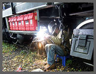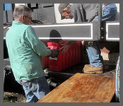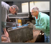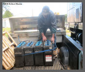 Once we had 1,100 pounds of batteries on my truck, we went down to the BSOR shop to return them and pick up four brand new "Rolls" batteries. We slid the four new ones off the truck and into the battery compartment. We then removed four more old ones. | ![]() |