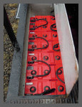 | The rest of May was spent cleaning winter grime from the locomotive and securing cables under the frame with custom made wooden insulation clamps. The 5/8" hanger bolts on the frame had to be straightened and the threads "chased" with a thread cutter. Jim Long did a great job scraping crud from the frame and then priming and painting all the new hardware and clamps we needed. He and Bob also added four newly fabricated wire rope hangers. |