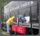 | July 2nd was spent taking care of minor details on the clamps under the locomotive. We also made a short trip down the tracks to our storage site to get some materials. The BSOR was informed in June that the "James E Strates" Fair Train would be arriving early and that they needed to make room to store the over 45 flat cars from the train. We were very anxious for our first start up of the year so on July 9th we decided to try the fully charged 12 used batteries we had on board. Once we had the engine pre-lubed and barred over, we pulled the six compression plugs on the cylinders. The prime mover seemed to roll over easily as we held the start button. The compression plugs replaced and the fuel pump was turned on. "Thunk..thunk.......thunk..............thunk, was all we got. Sadly, not enough reserve power in the batteries for the engine to catch, we had to try! |