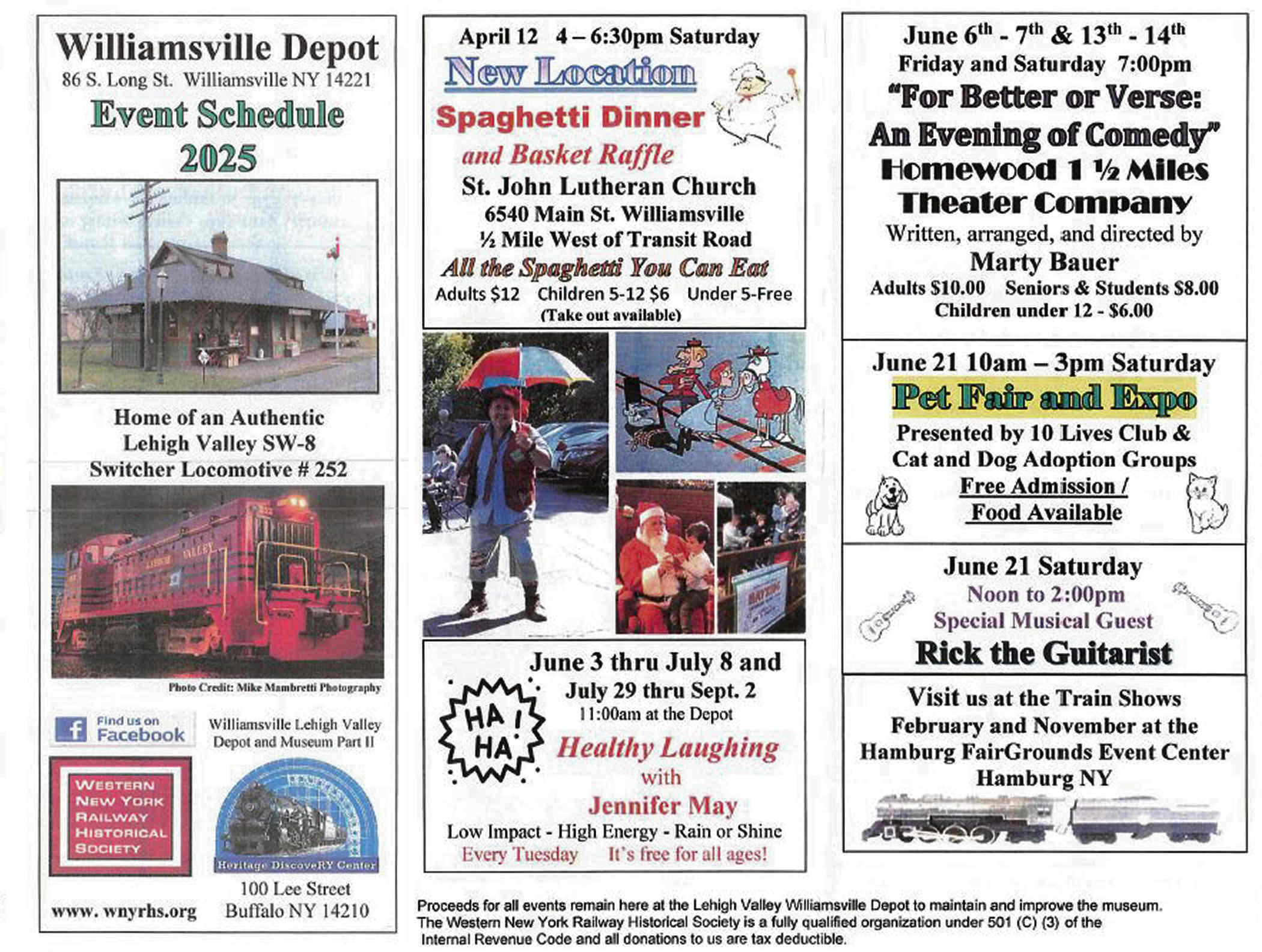 | More info at "Healthy Laughing" at the Depot This program will be held on Tuesday mornings from 11am - 12pm, beginning June 3rd till July 8th. Rain or Shine at the Williamsville Depot, 86 South Long Street, Williamsville, NY. Free Admission. |