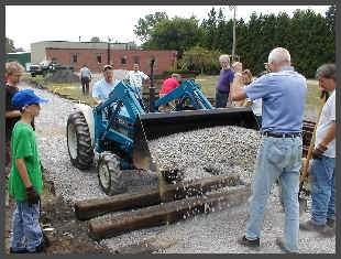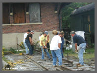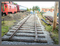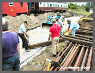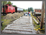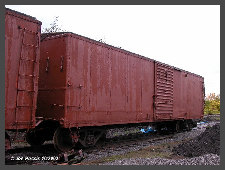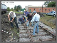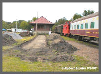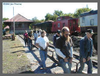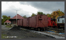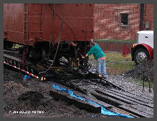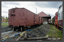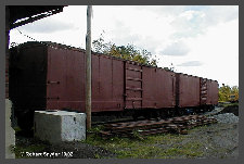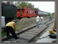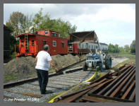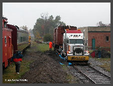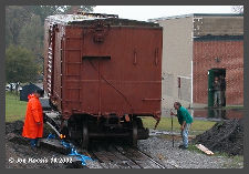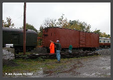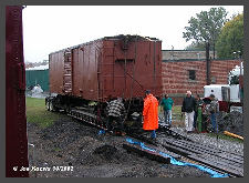 | The first car is slowly pulled to the end of the siding and the handbrake set and the wheels chocked. Once it is in place, the second car is spotted in the same manner. Looking not much unlike a slightly used "Roundhouse"® Kit, the two 40 foot cars will need a little work to make them look new again. A "Portapower"® ram will help straighten out the bent ladders and brake rigging. All the doors work quite well considering these cars were built in 1927! They were among the first all steel box cars built and share many of the same characteristics to the "X-29" type cars developed by the Pennsylvania railroad in 1924. Originally built by a subsidiary of the Baltimore and Ohio Railroad, our cars were part of a group of 13 identical box cars bought in 1967 by the Arcade and Attica Railroad. These thirteen cars were the first A&A cars used in interchange service for the shipment of "Creamora" from the Borden Company plant in Arcade. Reisdorf Brothers Feed Mill in North Java, NY., bought them from the A&A in 1969 until now, where they have found a home next to the same rails that they may have traveled over 50 years ago! Some of our Society members are working on tracing their exact heritage based on reporting marks buried deep under many layers of paint. With the weather closing in on the depot site, lettering will be put on hold until next spring. |