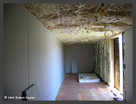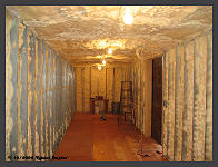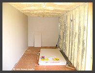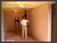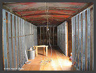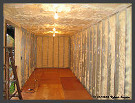 | When the spring weather broke, work again began in ernest on the walls of the boxcar. The "Depot Crew" was pumped as they saw the "headlight at the end of the tunnel!" The dry WNY spring made for fast work with the taping and joint compound. A primer/sealer coat was applied and then then followed up with a coat of "Sandstone Beige." |