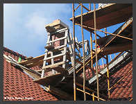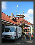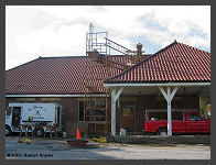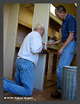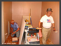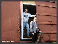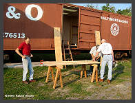 | While work on the roof progressed, Bob R. kept his crew busy with B&O Boxcar #276513. The sturdy shelves are being made from 2x2's and 3/4" plywood. Each shelving unit will be able to hold 60 standardized boxes of railroad records, drawings, waybills and related books. The shelves are spaced so that they can be accessed from both sides. Now all we have to do is to get someone to catalog everything! |