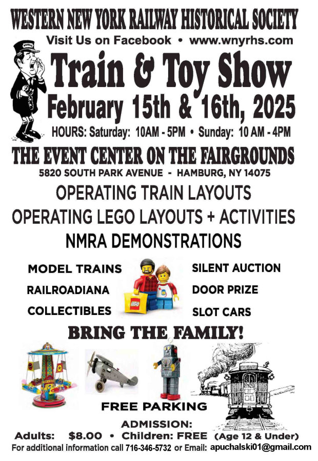 | Save on: All gauge Model Trains, Railroad Collectibles, Train Books and Videos, Collectible and Die-cast toys, Miniatures, Lionel - American Flyer - MTH - K Line and more! Admission is still only $8.00 , KIDS 12 and under are FREE! Two day Adult Pass $12.00. "Skip the line - Save some time!" Buy your admission tickets now and avoid waiting in line to buy at the door. You'll get an eMail link to print out or store on your phone that will get you in just like at last years Erie County Fair. A small service fee will be applied at the FairGrounds secure checkout. Bring the whole family to the biggest Fall Train and Toy show of the year. Plenty of FREE parking available! Proceeds benefit the preservation and restoration projects of the Western New York Railway Historical Society. For more Information or to Reserve Table Space Web Site Hosting by TRAIN WEB The WNYRHS, Inc. 100 Lee Street, Buffalo, NY. 14210 is an independent organization and has no affiliation with any other local or national group. |