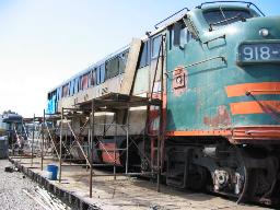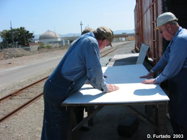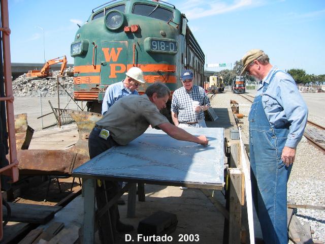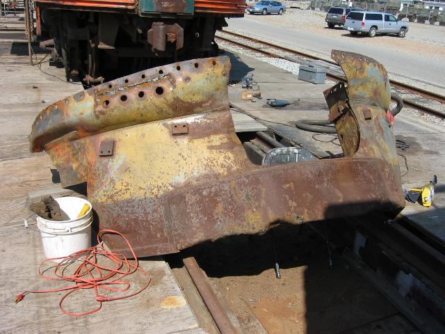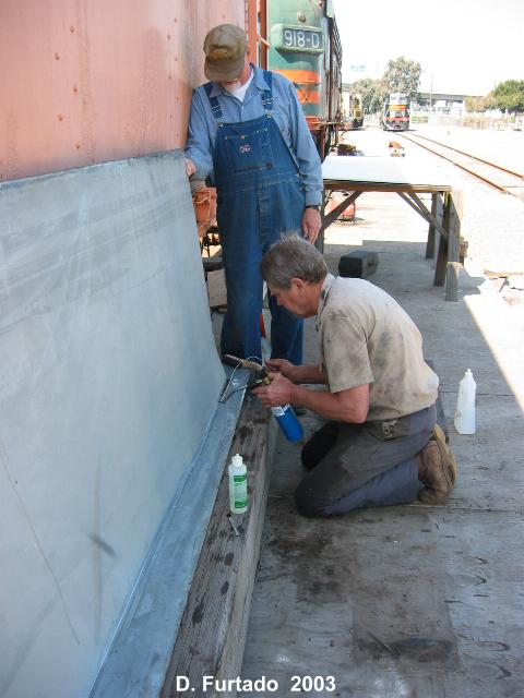 cutting bolts and removing the old MU hoses. The pilot will be repaired and restored back to it's early 50's appearance. Phil Copple, Don McPherson, Jon Vlasak and Al Fowler worked on this. -Dan and Don replaced the upper side panels. New metal was welded in and other repairs made. |