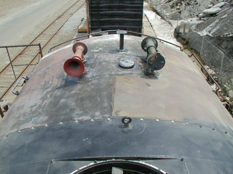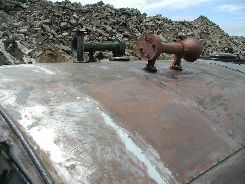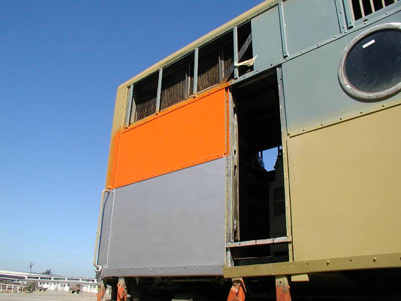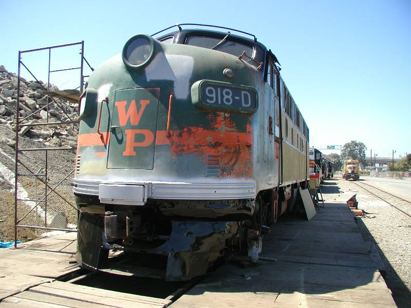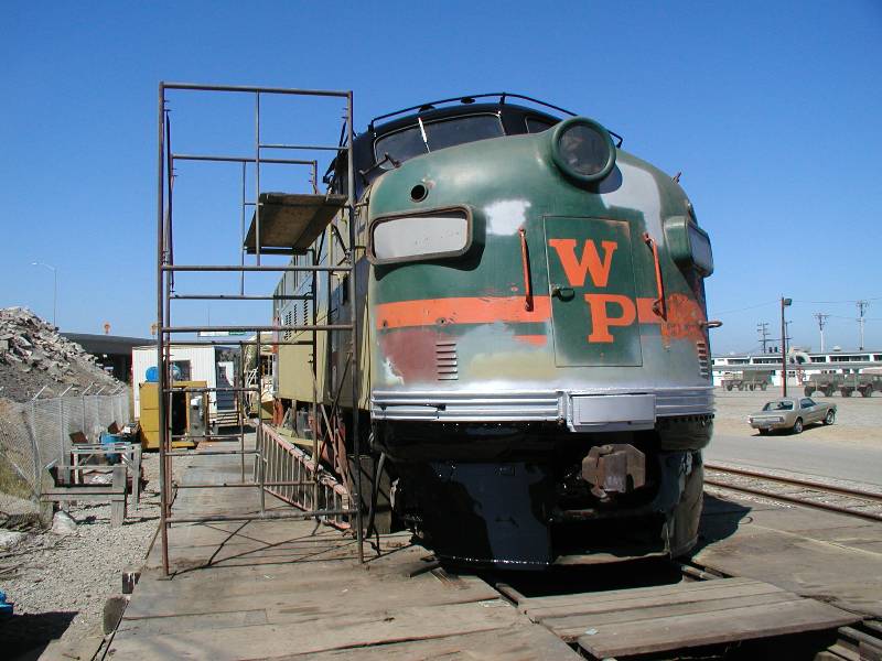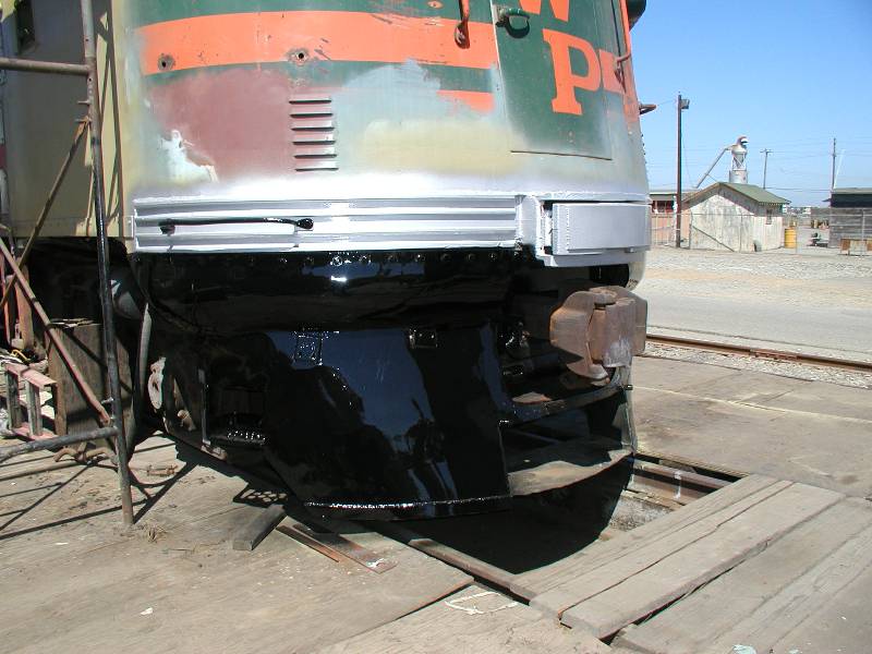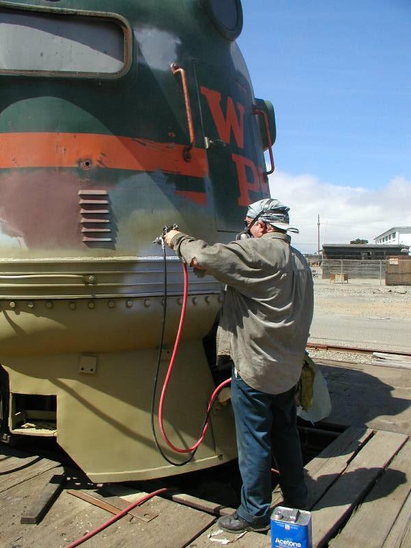 Final painting has begun on the roof. Next, final painting will progress toward working down. The shutter panels will be painted silver. The mid panels painted orange and the lower "ply-metal" panels painted silver. Stencils are being prepared for the lettering. The nose will be saved for last because of the amount of work that will be required to make it look right. Research is being done to accurately letter and stripe the locomotive as it appeared during the early 50's. WP had two different versions of the orange and silver paint for freight F7's. There was the "as delivered" version that included 6 5/8" "EMD Gothic" letters on the side panels and orange/black "pilot stripes" on the pilot. Later WP went to larger 15" letters on the sides and solid orange pilots and a few other minor differences. 918 will be painted in the as-delivered version. We are going for a circa 1953 appearance due to the larger fuel tanks that were expanded around 1952 from 1200 gallons to 1500. We will be recreating the fuel tank skirts that were removed during the 60's. Some grab irons were added during this time period and will remain. Thanks to Rob Sarberenyi, Howard Wise, George Childs, and Portola Railroad Museum (FRRS) for assisting in our research. |