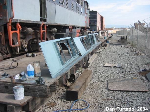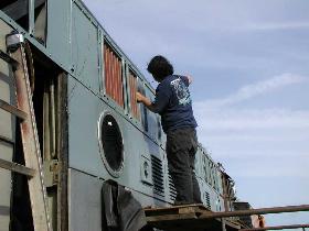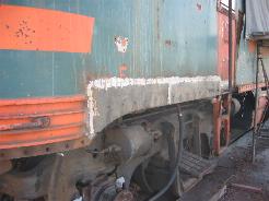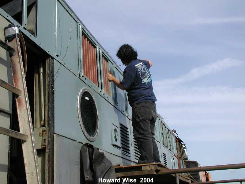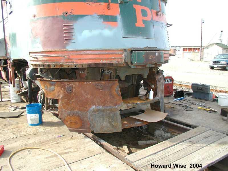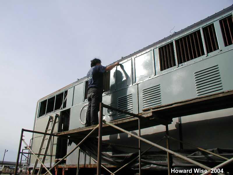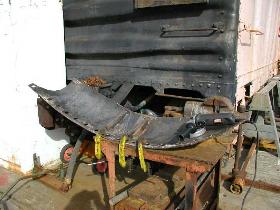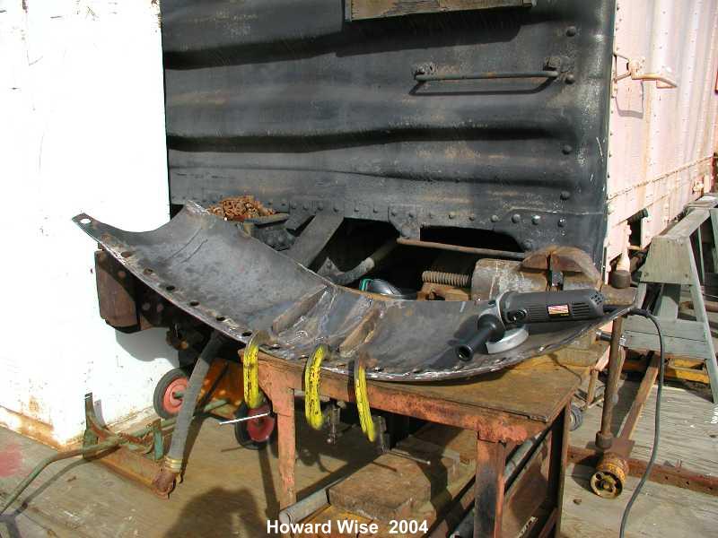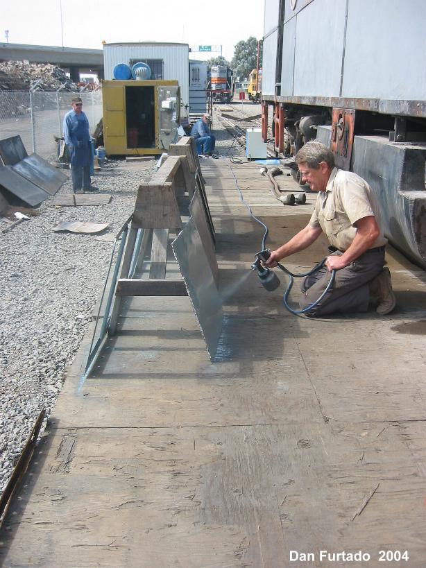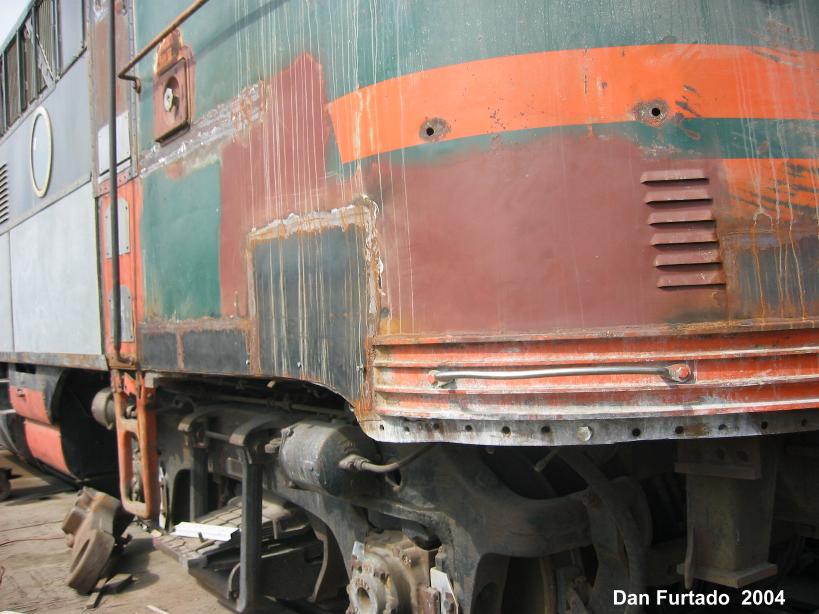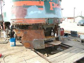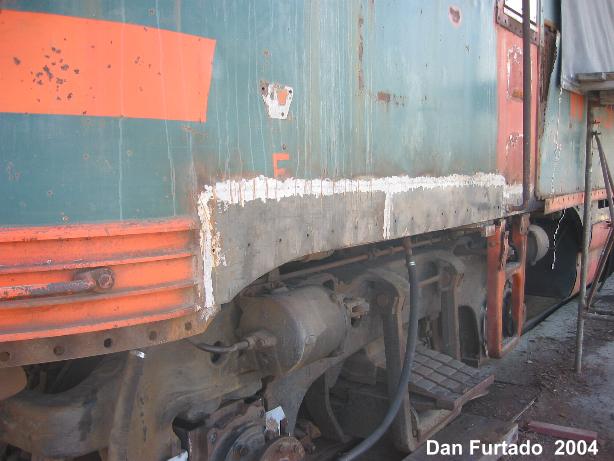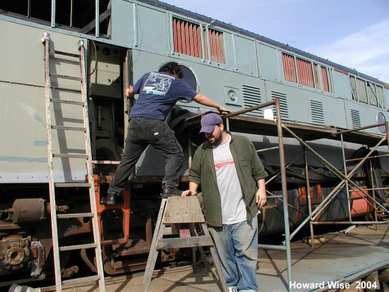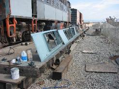 During the past 2 months we picked up some new and much needed help. New members Guy Kelley, Luke Kelley and Mhat Bernstein have been showing up just about every week since January. Don McPherson and Jon Vlasak have been hard at work on the pilot. The upper curved part of it was so badly damaged that it was decided to cut that section off and replace it with new metal. That has proven to be quite a job. We had some metal formed at a metal shop, then Don had to come up with a way to create the other curve. A little hard to explain here, but suffice to say it's been quite a project. He did come up with a way to stamp in the other curve. The left side is almost done. During January, the brake rigging on the lead truck was removed. Bushings will need to be made to replace the old ones that were badly worn. There was some very noticeable slop in the parts that caused uneven and premature wear on the brake shoes and some parts. The new stainless bolts that will be used to hold the side panels in place arrived on 2/28. Cork gasket material was placed between the panels and the frame. Guy, Mhat, Luke and Dan Furtado worked on installing the new bolts on 2/28. |